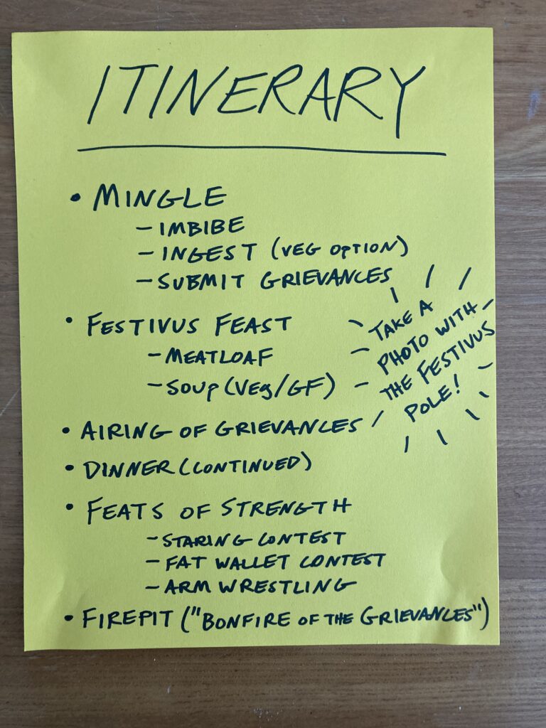 As folks appeared, I had them scrawl down their top grievances on paper and drop them into a box for shuffling and eventual reading out loud during the Festivus feast. Since numerous attendees came from different social circles and didn’t necessarily know one another, I let them know that they didn’t need to call anyone out – they could vent about anything that disappointed them! I also encouraged folks to gather by the Festivus pole for photos or just to admire the strength-to-weight ratio.